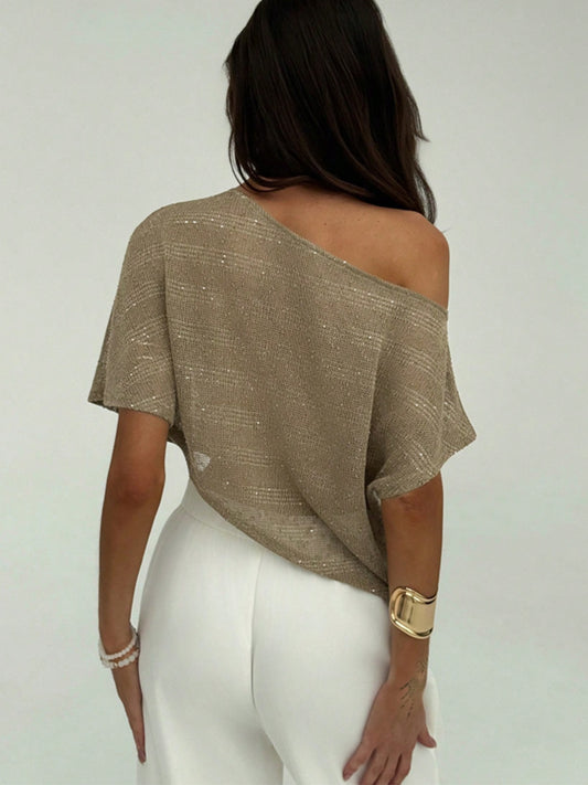 AliExpress foreign trade 2025 summer cross-border European and American loose T-shirt slanted shoulder SMS sequins semi-transparent pullover top for women