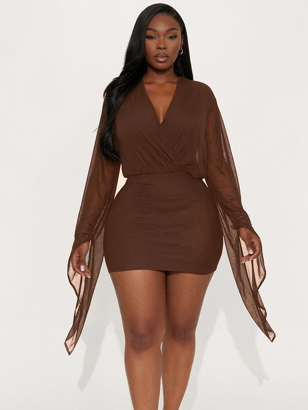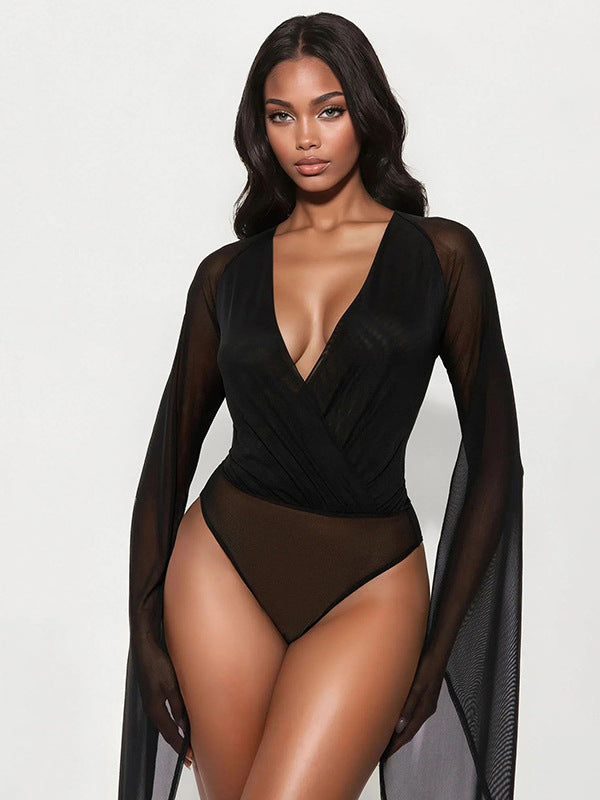 Cross-border new European and American clothing hot girl style sexy deep V see-through mesh top hip short skirt suit for women