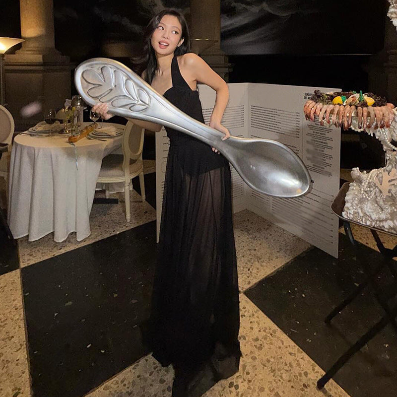 European and American cross-border women's clothing spring and summer new Jin Zhini sexy mesh splicing sleeveless slim halterneck dress for women