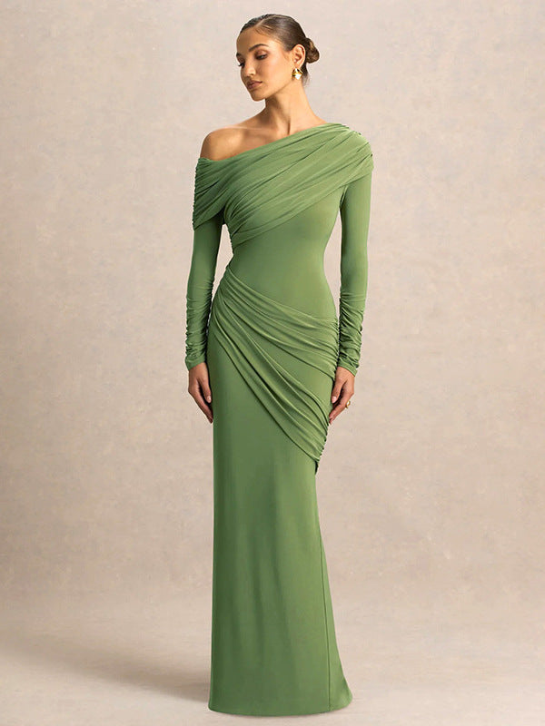 Foreign trade European and beautiful women's autumn and winter new fashion solid color diagonal collar long sleeve irregular pleated temperament hip wrap dress