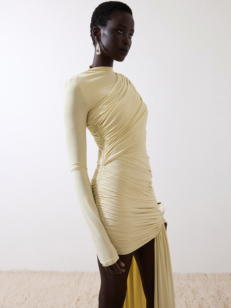 Foreign trade autumn and winter new European and beautiful fashion solid color crew neck long sleeve pleated hip irregular streamer dress