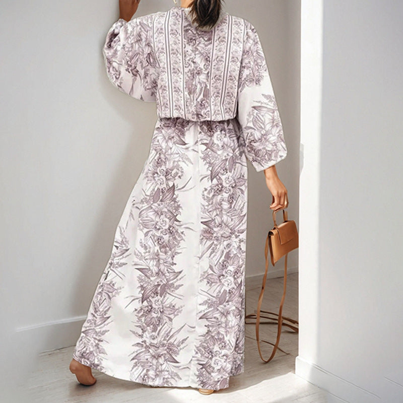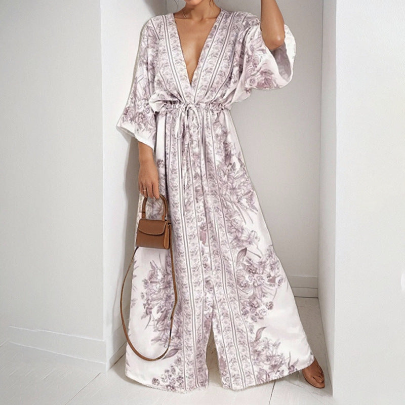 AliExpress 2025 spring cross-border new European and American clothing temperament sexy V-neck print strap-on big swing dress