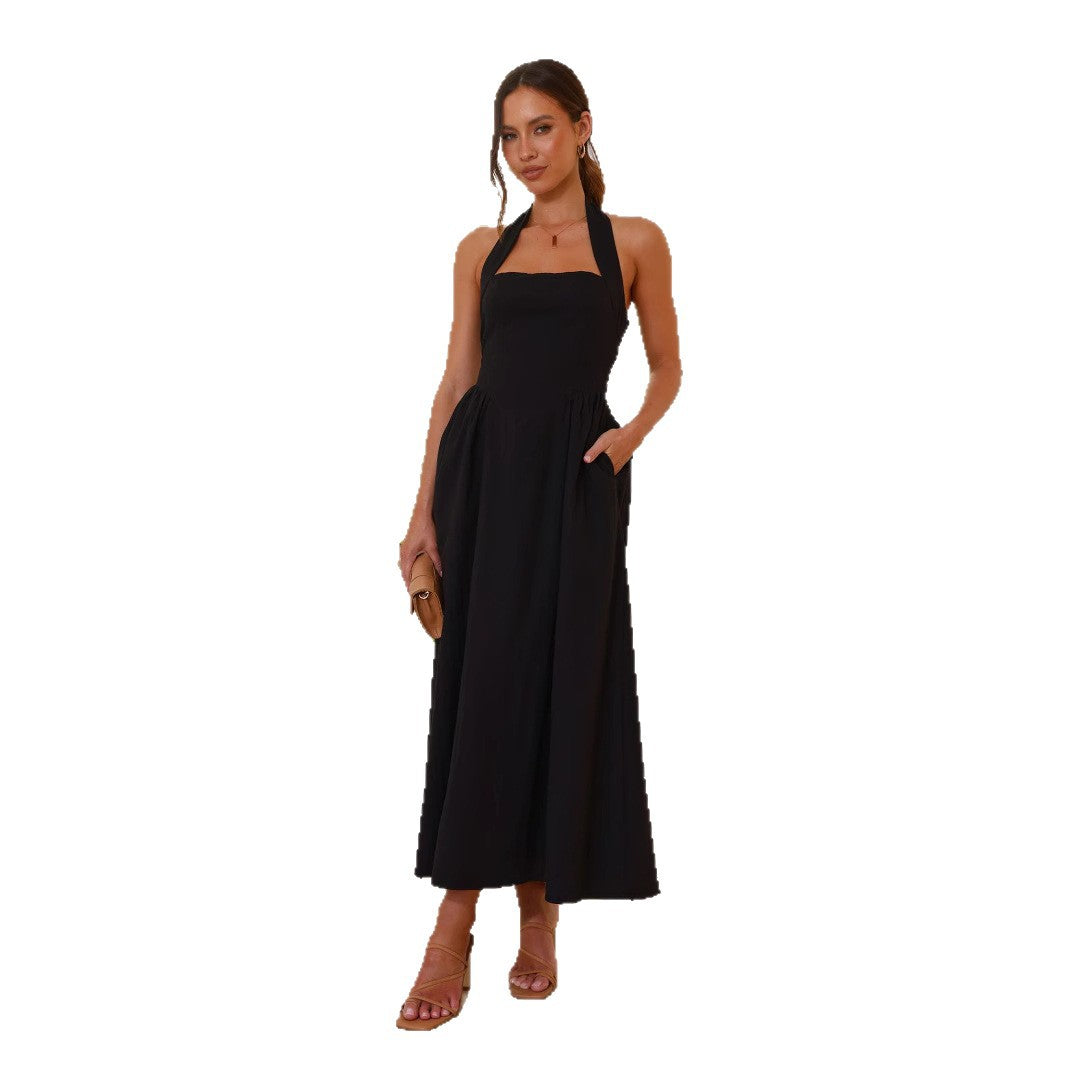 Cross-border Europe and the United States 2025 summer new women's temperament solid color square neck sleeveless waist halterneck backless dress for women