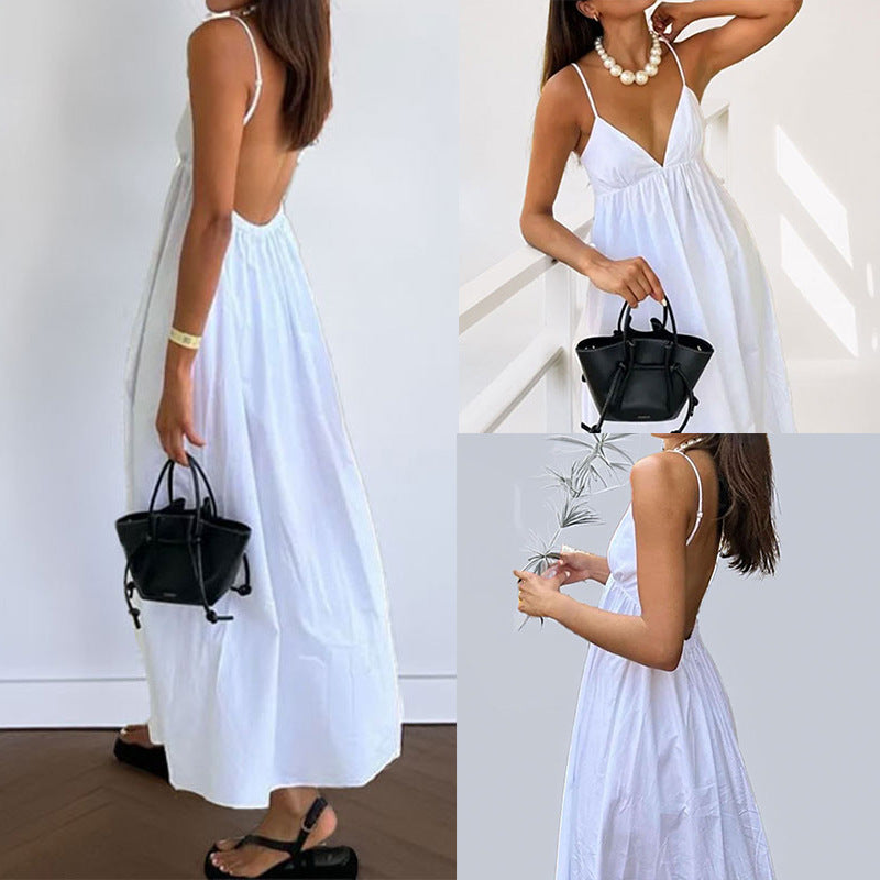 2025 New ArrivalAmazon Autumn European and American Women's Fashion Sexy Open Back Versatile Solid Color V-Neck Slip Dress