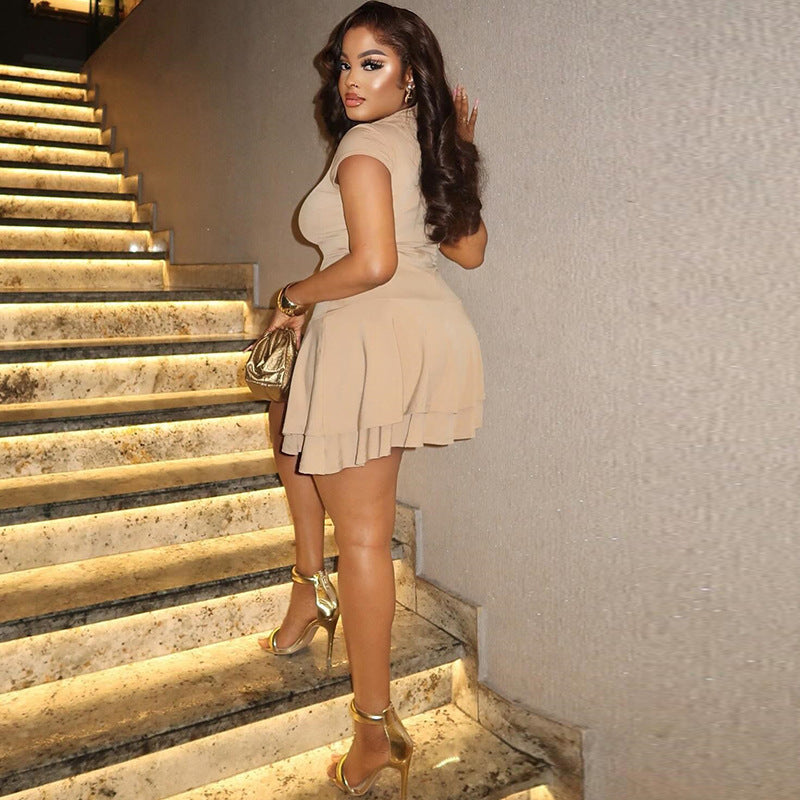 Cross-border Amazon European and American women's clothing 2025 spring/summer new solid color stand-up collar layered waist short temperament dress