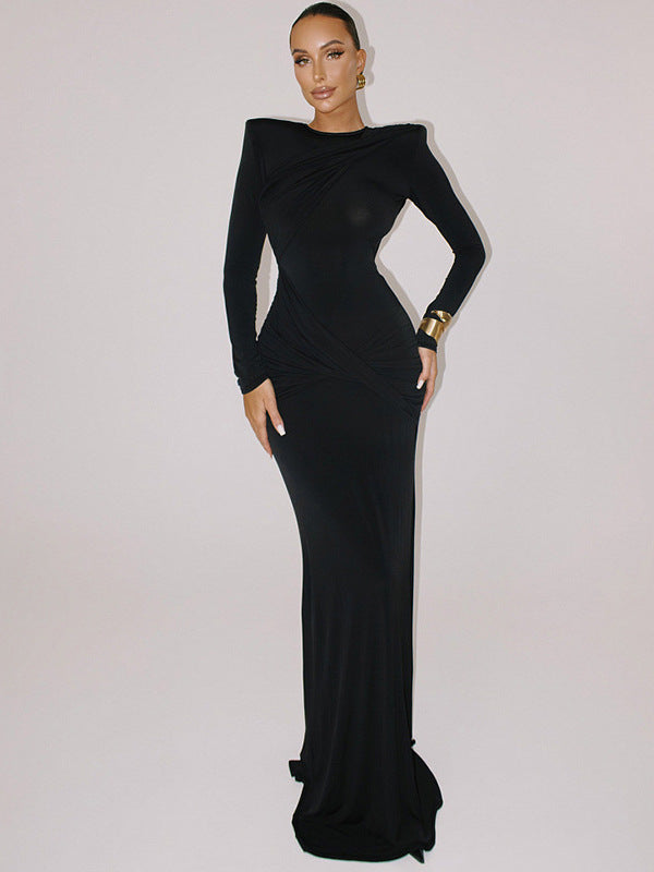 Cross-border autumn and winter new European and American fashion solid color crew neck sexy open back pleated slim hip hugging dress for women