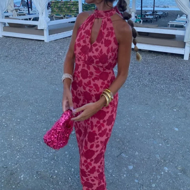 Spring 2026 New European and American Clothing Elegant Printed Halterneck Hollow Sleeveless Slim Dress 661