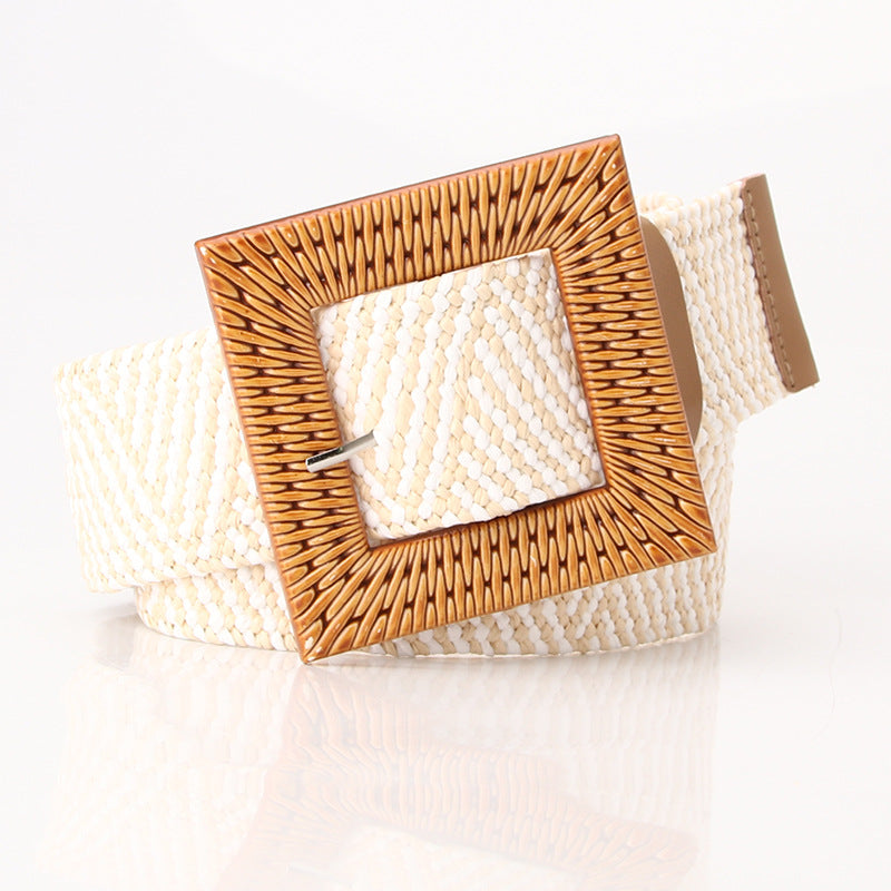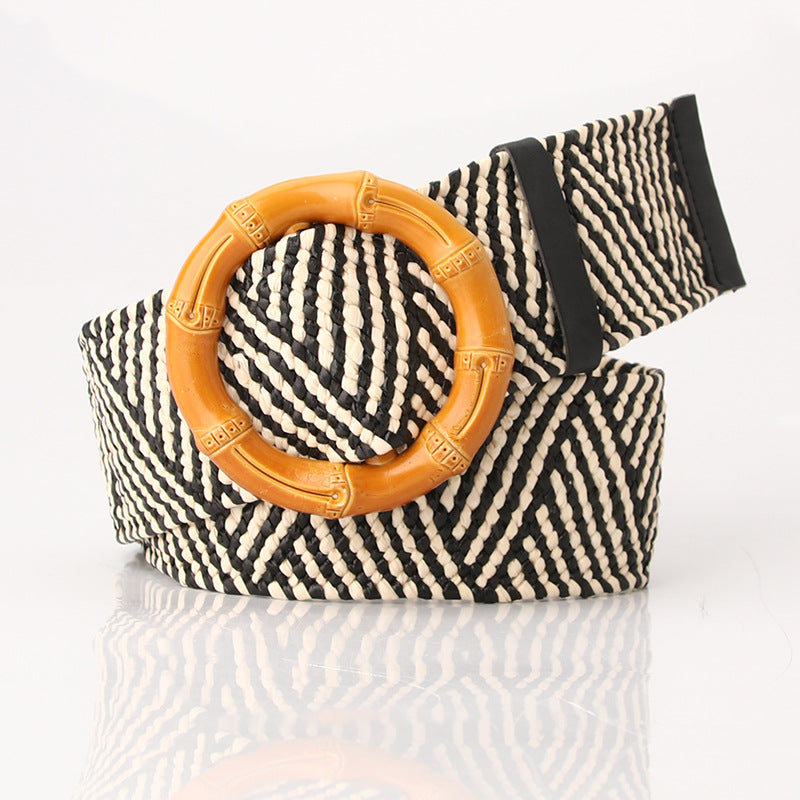 Cinto de senhora Mori, largo, simples e versátil, em imitação de palha entrançada, com fivela redonda. Cinto decorativo para vestidos, em tecido elástico de algodão e linho entrançado.